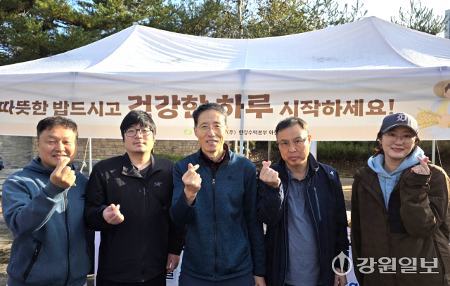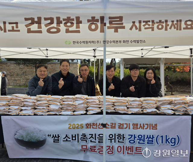 수력발전소는 지난 1일 화천에서 열린 산소길 걷기대회장에서 참가자들에게 쌀을 전달하며 더 편리하고 가치있는 세상을 위해 한수원이 달려나가고 있음을 알리는 캠페인을 펼쳤다.