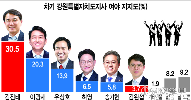 강원일보가 창간 80주년을 기념해 실시한 내년 강원도지사 선거 여론조사도 그렇다. 지난 3일과 4일 자 보도에 따르면 국민의힘에서는 김진태 현 지사, 더불어민주당에서는 이광재 전 지사와 우상호 대통령실 정무수석이 앞서가는 것으로 나타났다. 이 여론조사 공개 후 정치권에서는 ‘김진태의 선방’, ‘이광재의 여전한 영향력’, ‘우상호의 선전’이라는 분석이 돌았다.