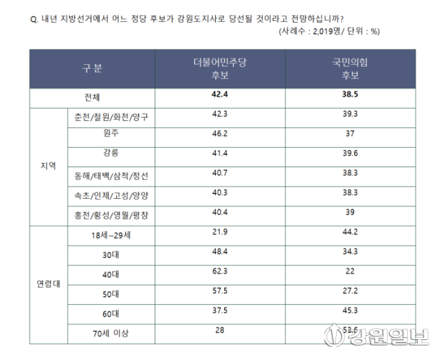 도정 평가와 각 후보 지지율 합산 결과도 비슷했다. 김진태 도정이 잘하는지, 잘못하는지에 대해 묻자 46.5%는 ‘잘못한다’라고 응답한 반면 ‘잘한다’는 39.4%에 그쳤고, 후보 지지율도 민주당 4명의 후보(이광재, 우상호, 송기헌, 허영)의 합이 46.5%, 야당 측은 김진태와 김완섭을 합쳐 34.2%에서 멈췄다.
