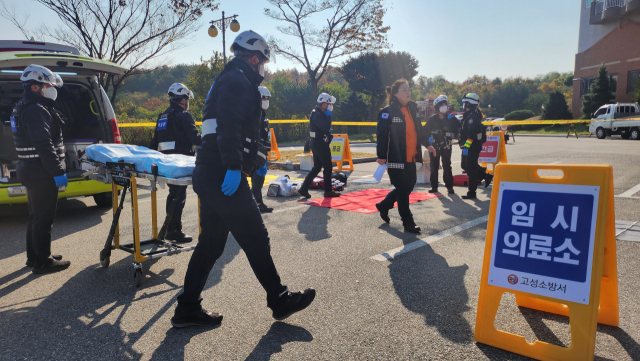 훈련에는 고성군과 군·경 등 23개 유관기관·단체에서 380여명의 인력과 장비 72대가 동원됐다. 각본과 내빈 등의 행사성 요소는 배제했다.