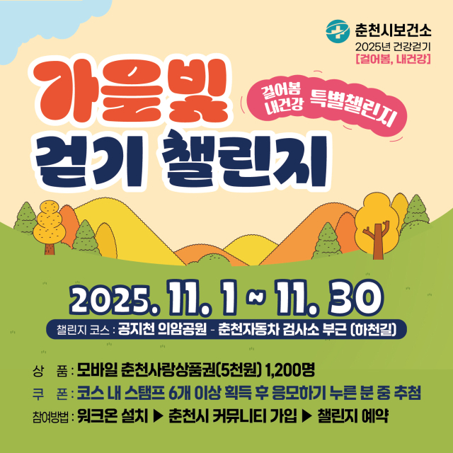 이번 챌린지는 춘천시 대표 걷기 프로그램인 '걸어봄, 내건강'의 특별 이벤트로 일교차가 커지는 가을철 줄어드는 신체 활동을 보완하고 일상 속에서 즐겁게 걷기를 실천하기 위해 마련됐다.