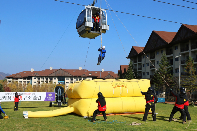 또 보조 원동기를 가동하지 못하는 최악의 상황에 대비해 케이블카 아래 에어매트를 설치한 뒤 구조대원들이 케이블카·리프트 전용 구조장비를 이용한 고객 구조 훈련을 펼쳤다.
