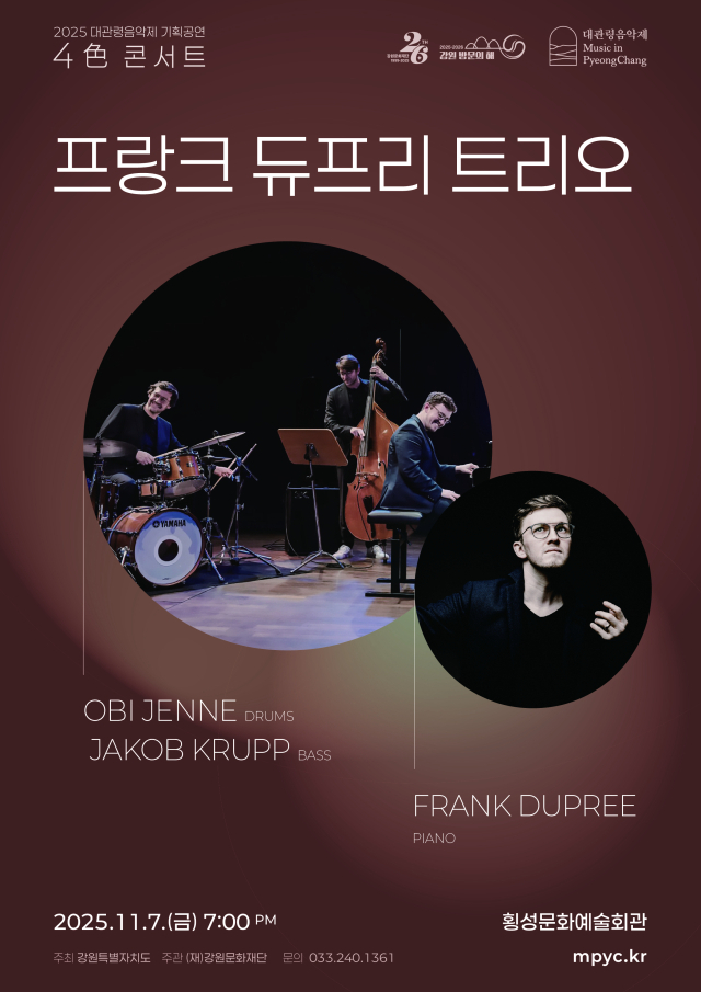 4色 콘서트는 7일 횡성문화예술회관에서, 8일 삼척문화예술회관에서 연이어 개최된다. 7일 무대에는 재즈 트리오 ‘프랑크 듀프리 트리오’가 오른다. 지난 2022년 대관령음악제 기획공연을 통해 처음 한국을 찾은 이들은 클래식과 재즈 넘나드는 연주로 반가운 인사를 건넨다.