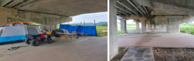 지난 7월 횡성군은 진천 교량 아래에서 장기간 설치된 텐트와 식탁, 취사도구를 발견, 불법 점용 행위로 확인하고 공문을 발송했다. 14일 뒤 이 시설물은 자진 철거됐다.