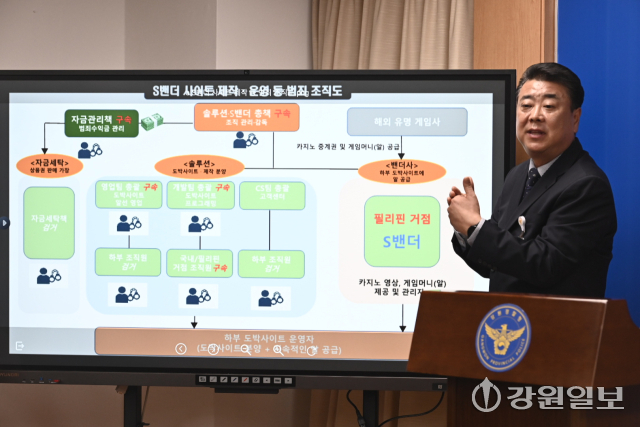 강원경찰청은 6일 기자실에서 필리핀 거점 5조 3,000억원대 도박사이트 제작 관리 일당 검거 관련 브리핑을 진행했다.