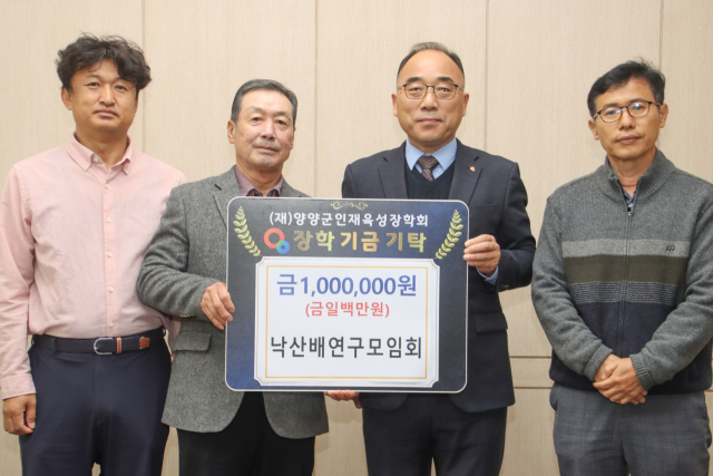 낙산배연구모임회(회장:김명학)은 지난 7일 양양군청을 찾아 탁동수 양양군수권한대행에게 인재육성장학기금 100만원을 전달했다.