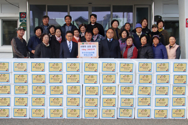 한국자유총연맹 양양군지회(회장:김연길)은 지난 7일 양양군청 현관 앞에서 탁동수 양양군수군한대행에게 김장김치 10㎏ 200상자를 기탁했다.