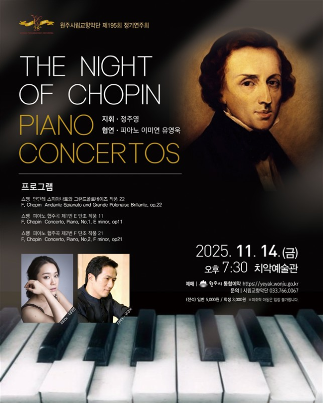 【원주】원주시립교향악단은 오는 14일 오후 7시30분 치악예술관에서 제195회 정기연주회 ‘The Night of CHOPIN’을 개최한다.