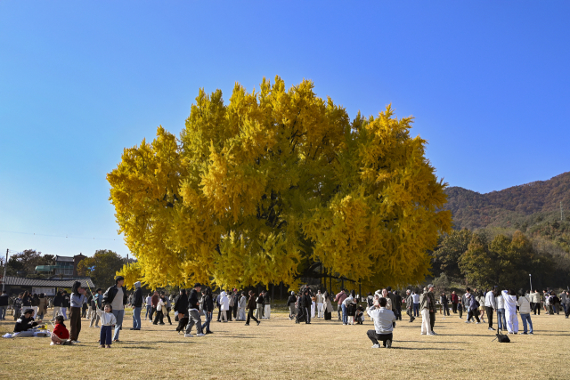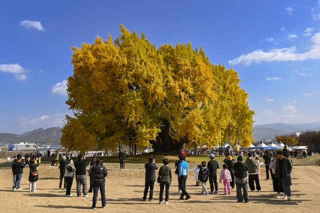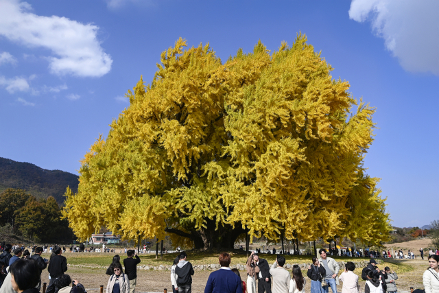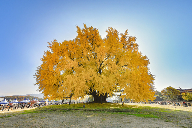 원주 문막읍에 있는 반계리 은행나무가 완연한 가을에 맞춰 노랗게 익어가고 있다. 1964년 천연기념물로 지정된 반계리 은행나무는 국내 최고령 은행나무 수목으로, 국립산림과학원이 1,318살로 공식 인정했다.