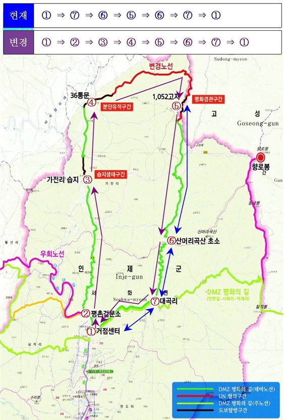 현 코스는 백두대간을 바라보는 웅장함은 있으나 접경지역의 특수성을 느끼기에는 부족한 면이 있기 때문이다.