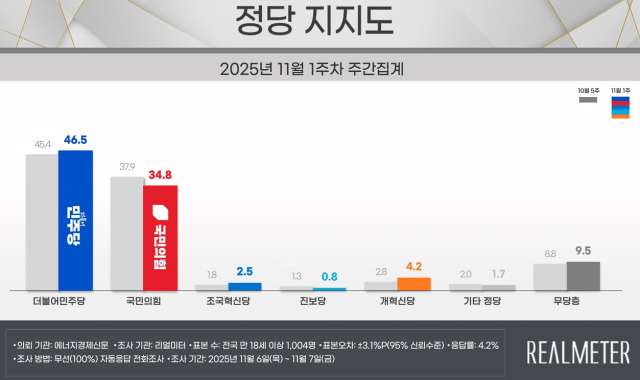 더불어민주당은 이 대통령의 국정 성과와 코스치 최고치 경신 등 경제 회복 신호와 전 정권 사법리스크 부각에 따른 반사이익을 얻으며 2주 연속 상승 폭을 그렸다. 국민의힘의 경우 APEC 성과 부정과 추경호 구속, 한동훈 계엄 발언, 전 정권 관련 사법 리스크가 맞물리면서 핵심 지지층인 PK(부산·울산·경남) 지역과 70세 이상 고령층, 보수층 이탈이 컸던 것으로 파악되고 있다.