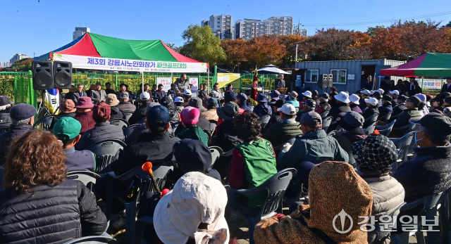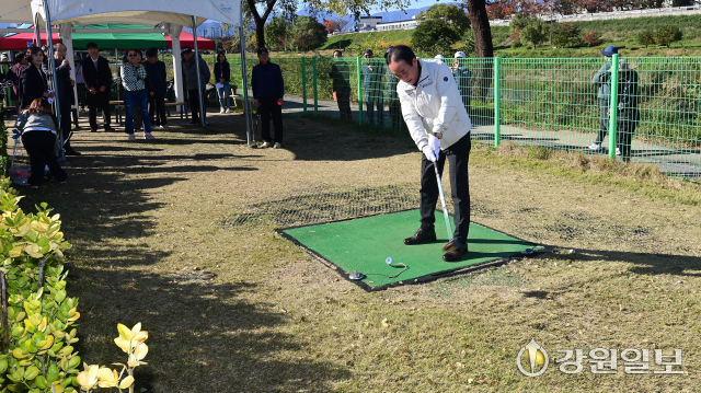 '강릉시 노인회장기 파크골프대회’가 10일 강릉파크골프장에서 김홍규 강릉시장, 최익순 시의장, 심재빈 대한노인회 강릉지호장, 권영만 체육회장을 비롯한 27개 팀, 144명의 선수와 심판 47명 등 총 200여 명이 참석한 가운데 열렸다. 강릉=권태명기자