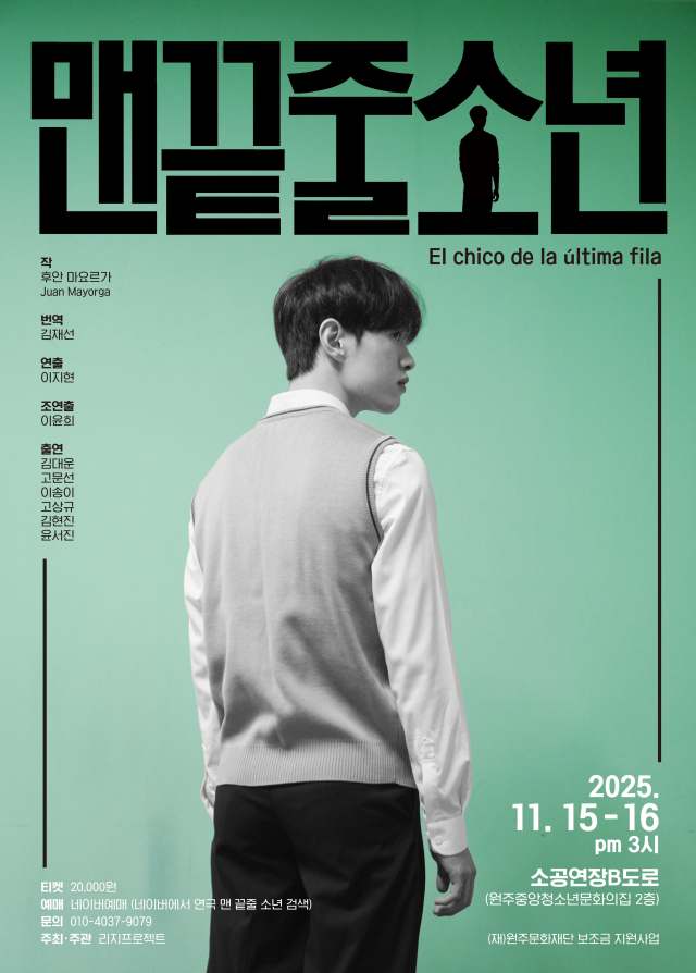 공연예술창작그룹 리지프로젝트가 오는 15일과 16일 원주 소공연장B도로에서 연극 ‘맨 끝줄 소년’을 공연한다.