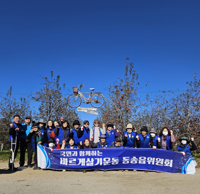 바르게살기운동 동송읍위원회(위원장:구한서)는 11일 동송읍 이평1리 마을에 위치한 박정목씨 과수농가를 찾아 사과 수확 봉사활동을 펼쳤다.