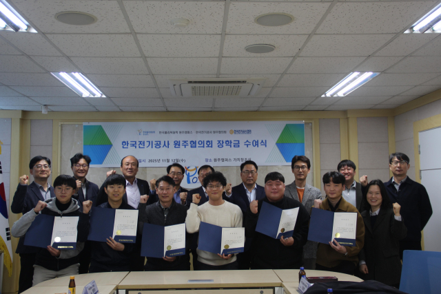 한국폴리텍대학 원주캠퍼스(학장:권민수)와 한국전기공사협회 원주지역협의회(회장:이대화)는 12일 대학에서 장학금 수여식을 열어 전기제어과 우수 학생 6명에게 장학금을 줬다.