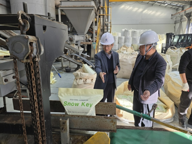 강원지방조달청(청장:이경원)은 12일 횡성군에 위치한 친환경 제설제 생산기업 ㈜지오에코텍(대표:김운철)을 방문, 겨울철 폭설에 대비한 제설용품 생산 및 공급현황을 점검했다.