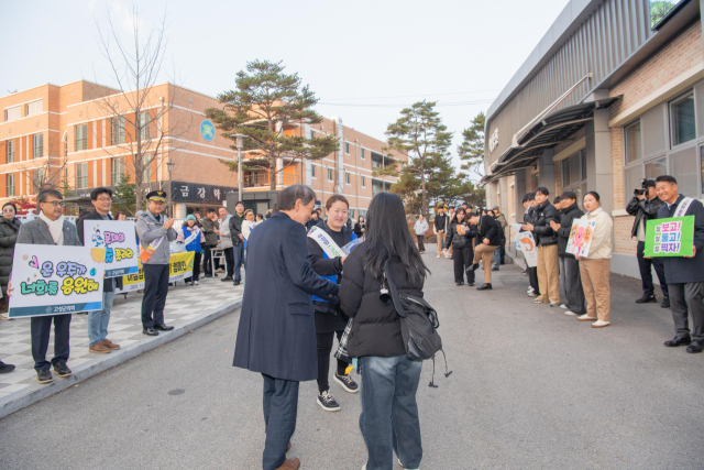 함명준 고성군수와 용광열 고성군의장, 홍성봉 고성교육지원청 교육장, 김종필 고성경찰서장, 한국여성농업인 고성군연합회(회장:윤미아)는 13일 고성고 정문에서 수험생들에게 찹쌀떡을 나눠주며 고득점을 기원하고 열띤 응원을 펼쳤다.