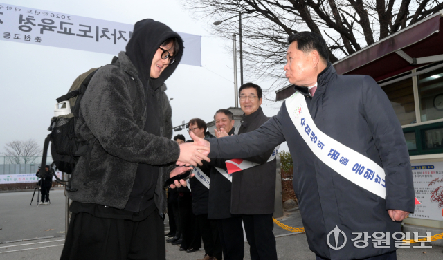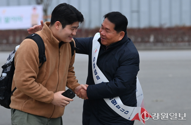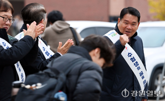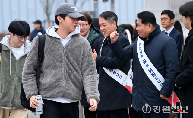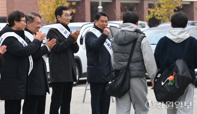 2026학년도 대학수능시험일인 13일 춘천고에 마련된 시험장에서 신경호 강원자치도교육감이 수험생들을 격려하고 있다.