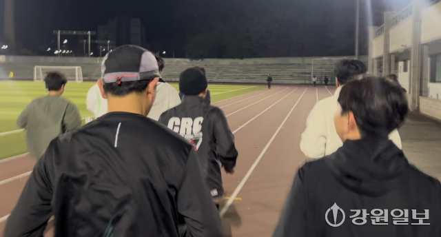 12일 오후 8시 강원대 대운동장. 춘천에서 규모가 가장 큰 러닝크루인 ‘춘천러닝크루’ 정기모임에 참여하는 사람들이 운동복 차림으로 하나둘 모여들었다. 인사를 나눈 뒤 각자 페이스에 맞춰 4개 그룹으로 흩어졌다. 기자는 러닝 초보 그룹에 합류해 4㎞를 1㎞당 7분30초 페이스로 들어오는 코스에 도전했다.