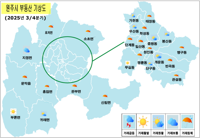 거래 동향은 '보통'으로 분류됐지만 시는 최근 3년간 부동산 거래량이 하락하는 추세라고 분석했다. 25곳 읍면동별 거래 동향에서 거래 활발은 무실동과 부론면 등 2곳에 그쳤다. 거래 원활은 7곳, 보통은 1곳, 침체는 15곳이다.