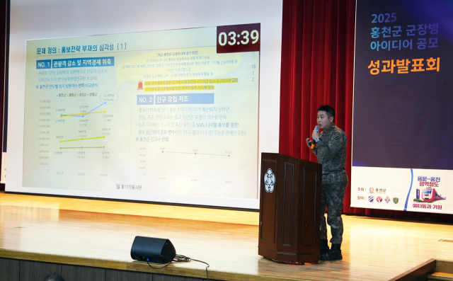 16일 홍천군에 따르면 ‘2025년 홍천군 군 장병 아이디어 공모전’에는 94개팀 361명이 참가했고, 1·2차 심사를 거쳐 9개팀이 최종전에 진출했다. 이들은 지난 13일 홍천문화센터에서 홍천군의 인구 유입 확대 방안, 민·관·군 상생 방안을 발표했다.