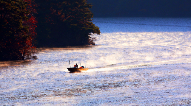 16일 오전 인제 소양호에서 한 내수면어업인이 아침 일찍 피어오른 물안개를 헤치며 조업에 나서고 있다. 사진=인제군청 제공