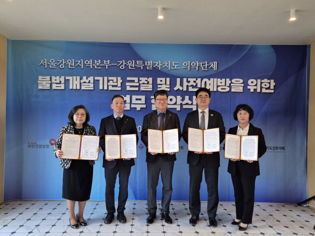 국민건강보험공단 서울강원지역본부(본부장:이용구)는 지난 14일 춘천에서 강원특별자치도치과의사회, 한의사회, 약사회, 간호사회 등 도내 단체들과 공동으로 불법개설기관 근절 업무 협약식을 개최했다. 본부 관계자는 “이번 공동 협약을 통해 불법개설기관을 근절하여 건강보험 재정 건전화와 공정한 의료질서 확립으로 지역민의 건강증진 향상을 위해 노력하겠다”고 밝혔다.