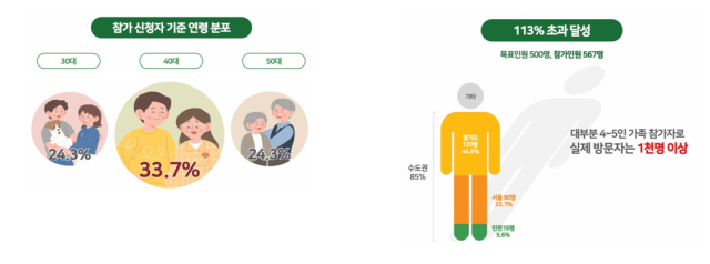 지난 9월12일 시작된 꿀여행페스타는 한 달 만에 목표 인원 500명이 조기 마감되며 높은 관심을 끌었다. 총 567명이 신청했고 지난 6일 기준 267명이 정산을 완료했다. 참여자의 84.3%가 수도권 거주자로 경기 44.9%, 서울 33.7%, 인천 5.6% 순이었다. 대부분 가족 단위로 방문해 실제 방문 인원은 1,000명을 넘었다.