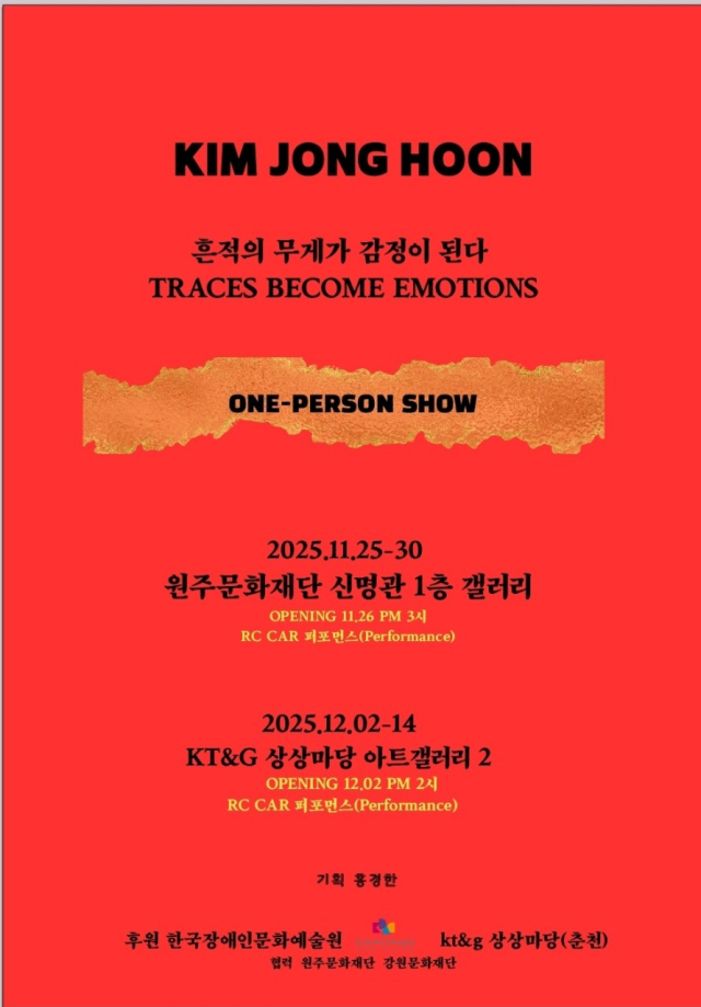 전시 개막식은 19일 오후 3시 전시장에서 열린다. 오는 26일 오후 3시에 작품 제작 퍼포먼스도 진행된다. 전시는 다음 달 2일부터 14일까지 춘천 KT&G 상상마당 아트갤러리 2에서 이어지며, 12월2일 오후 2시에 오프닝과 RC카 퍼포먼스가 마련된다.