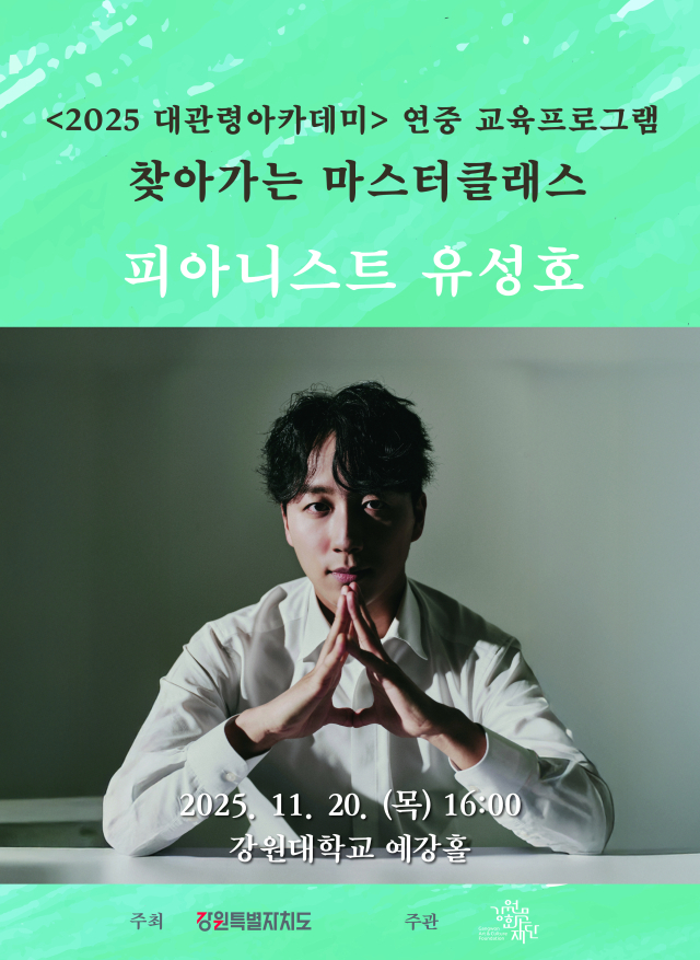 이어 오는 20일 강원대에서는 유성호 피아니스트의 ‘찾아가는 마스터클래스’가 열린다. 제73회 제네바 국제 음악콩쿠르 특별상과 2024 서울국제음악콩쿠르 우승을 거머쥐며 국제 무대에서 주목받는 유 피아니스트가 도내 음악 인재들을 만난다. 그는 연주 수업을 통해 후배 음악가들에게 교류와 배움의 장을 제공한다.