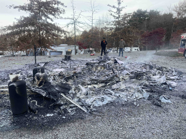 ◇17일 오전 8시께 횡성군 둔내면의 한 캠핑장에서는 카라반 차량에서 화재가 발생해 30여분 만에 꺼졌다. 인명피해는 없었다. 사진=강원특별자치도소방본부 제공