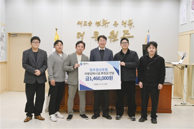 원주청년포럼봉사단(회장:고준영)은 지난 17일 원주시청 시장 집무실에서 원주댄싱카니발 부스 수익금으로 마련한 아동양육시설 후원금 146만원을 전달했다.