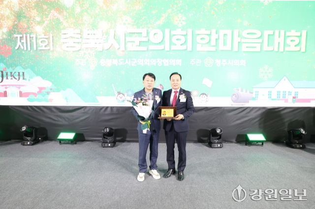 최익순 대한민국시군자치구의회의장협의회 사무총장(강릉시의회 의장.사진 왼쪽)은 18일 충북 청주시 올림픽기념국민생활관에서 열린 제1회 충북시군의회 한마음대회에서 김현기 충청북도시군의회의장협의회 회장으로 부터 지방자치 성장과 지방분권 실현에 공헌한 공로에 대한 감사패를 전달받았다.