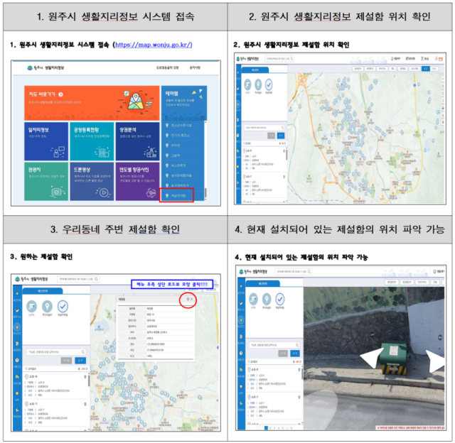 해당 정보를 기반으로 새롭게 구축된 제설함 위치 정보는 시 생활지리정보 시스템(map.wonju.go.kr/lifemap/portal)에서 확인할 수 있다.
