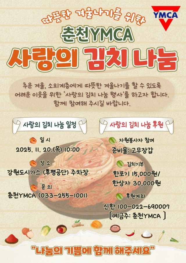 춘천YMCA가 20일 강원도시가스(후평공단) 주차장에서 ‘사랑의 김치 나눔’ 행사를 연다.