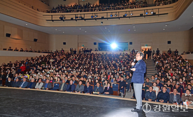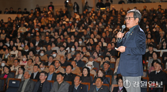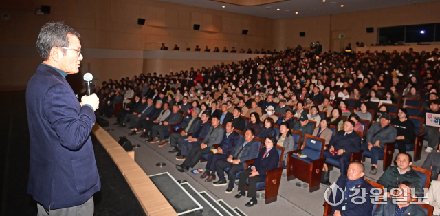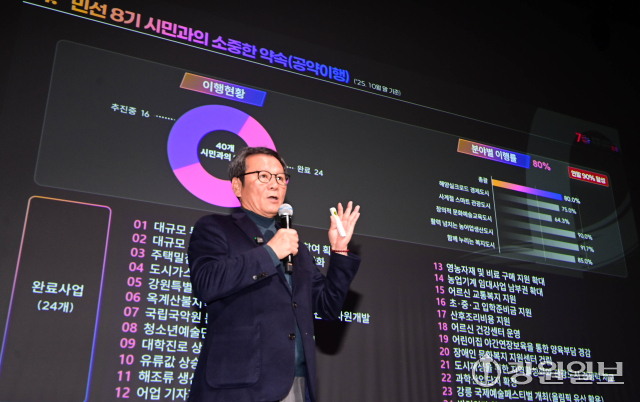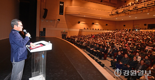 강릉시 ‘민선8기 2025년 시정설명회’가 19일 강릉아트센터 사임당홀에서 열려 김홍규 강릉시장이 항만과 철도 복합 물류 중심도시, 천연물바이오 국가산업단지 조성, 광역 교통망 확충, 2026 세계 마스터즈 탁구대회, ITS 세계 총회 등 다양한 역점사업들에 대해 설명하고 있다. 강릉=권태명기자