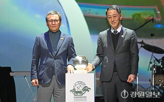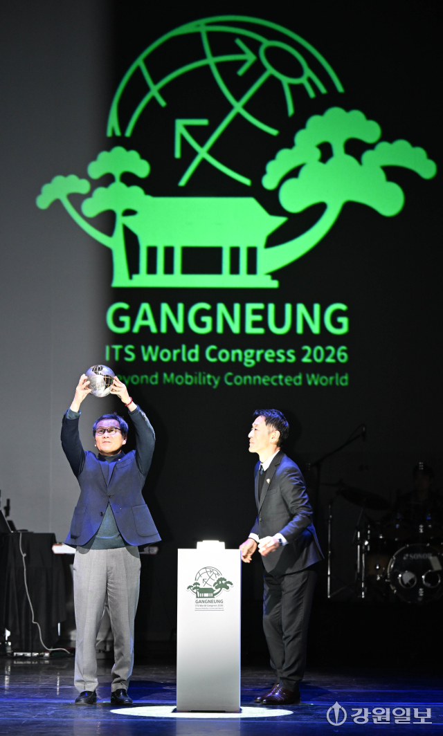 2026 ITS 세계총회 개최 붐업을 위한 글로브 세리머니가 19일 강릉아트센터 사임당홀에서 열려 김홍규 강릉시장이 김남구 ITS 세계총회 조직위원회 사무국장으로부터 총회의 상징물인 ‘ITS글로브’를 전달받고 있다. 국제 교통올림픽으로 불리는 2026 강릉 ITS 세계총회는 내년 10월 19일부터 5일간 강릉올림픽파크 일대에서 열린다. 강릉=권태명기자