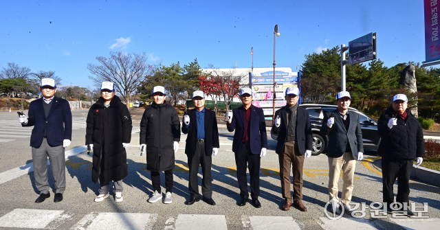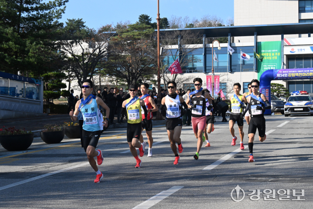 제34회 강원 역전마라톤대회에 참가한 각 시군 대표 선수들이 20일 강릉시청 앞에서 김홍규 시장과 최익순 시의장, 권영만 시체육회장, 김기현 강릉교육장, 이길우 강릉경찰서장, 우승룡 강원일보 강릉본부장, 최용수 도육상연맹 회장, 차주철 시육상연맹 회장 등 강릉지역 기관·단체장의 응원을 받으며 힘차게 출발했다.