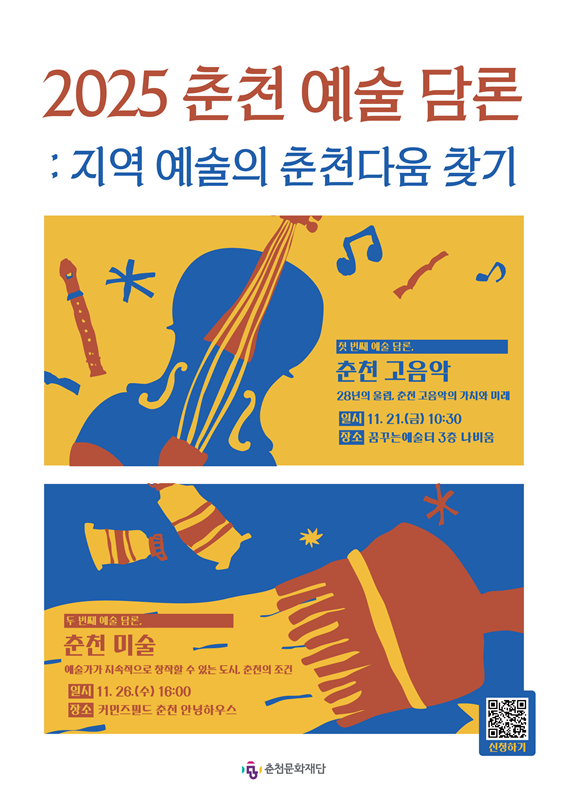 춘천문화재단 관계자는 “이번 예술 담론은 특정 단체나 협회에 치우치지 않고, 현장에서 활동하는 예술인의 실제 경험과 목소리를 중심에 두고자 마련된 자리”라며 “예술이 중심이 되는 도시, 춘천의 새로운 가능성을 함께 만들어 나가겠다”고 밝혔다.
