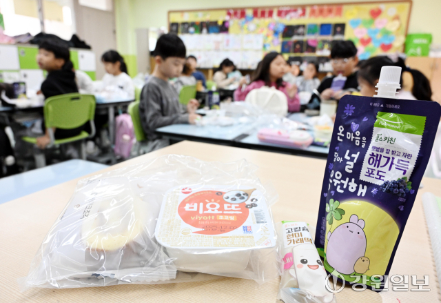급식소가 아닌 교실에서 딸기롤케이크, 가래떡, 토핑요플레, 포도주스 등 대체식을 받아든 아이들은 집에서 직접 가져온 도시락과 함께 떠들썩한 분위기에서 식사를 하기 시작했다.