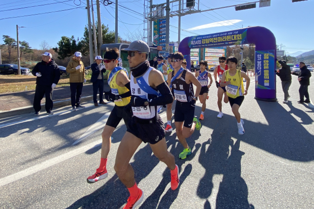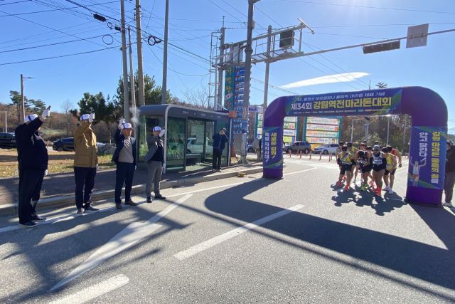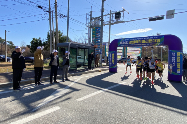제34회 강원역전마라톤대회 고성구간 시총식이 지난 21일 가진버스정류장 앞에서 김택진 고성군 관광경제국장과 홍성봉 고성교육지원청 교육장, 김주철 강원일보 고성지사장, 최용수 강원특별자치도육상연맹회장 등이 참석한 가운데 열렸다.
