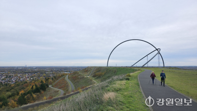 ■슬래그힙이 ‘도시의 공원’으로…환경·경관 재생의 현장을 찾다=에발트 단지 북쪽으로 들어서자 거대한 인공 언덕이 시야를 가득 메웠다. 탄광에서 나온 폐석과 석탄 찌꺼기가 쌓여 형성된 슬래그힙 ‘호헤바르트’다. 수년간의 복원 사업을 거쳐 생태공원으로 거듭난 이곳은 너르게 펼쳐진 잔디와 들판이 초록빛 수평선을 이루며 도심 속 힐링을 선사했다.