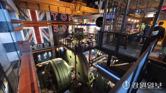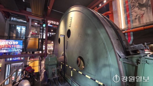 ■거대한 갱도 기계가 레스토랑 한가운데… ‘산업유산의 일상화’=에발트 단지 중앙부에는 탄광의 옛 작업동을 개조한 레스토랑 ‘Moto59 Foodgarage’가 있다. 내부로 들어서자 철제 케이블과 도르래, 광부들을 오르내리던 수직갱도 ‘샤프트 7(Schacht 7)’의 권양 설비가 위용을 드러냈다. 거칠게 마모된 금속 표면에는 긴 세월의 흔적을 짐작할 수 있었다.