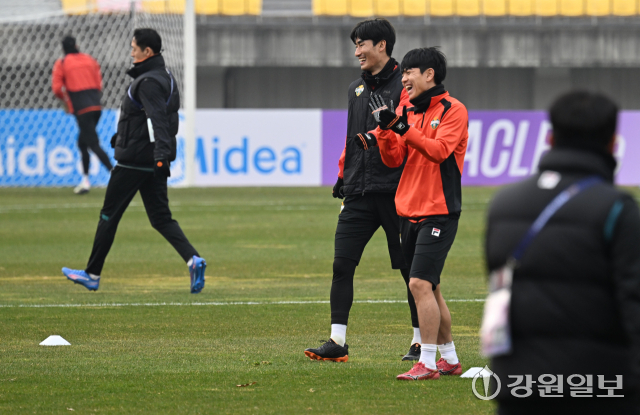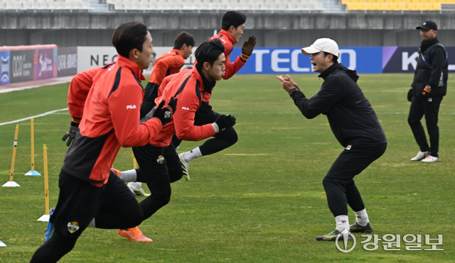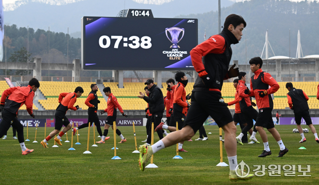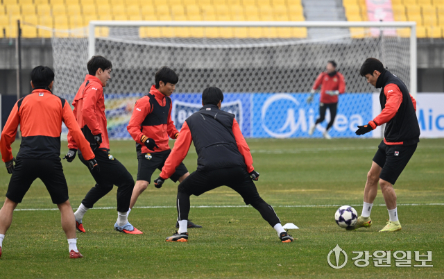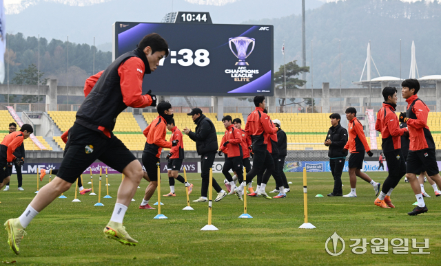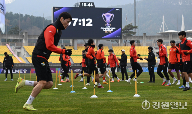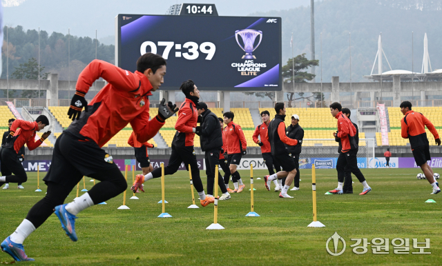'마치다 젤비아'와의 아시아챔피언스리그엘리트(ACLE) 홈 경기를 하루 앞두고 '강원FC' 선수들이 24일 춘천 송암스포츠타운 주경기장에서 미디어 공개 훈련을 하고 있다.