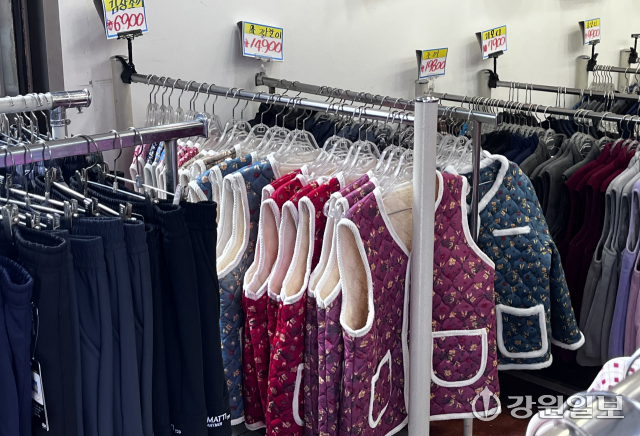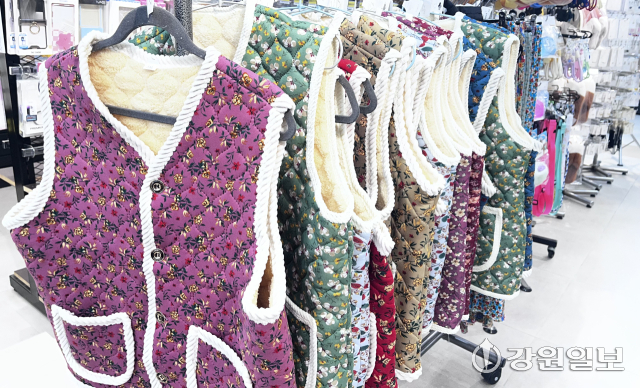 24일 오전 찾은 춘천시 명동거리. 모자·목도리가 한데 모인 잡화점과 의류매장 사이로 형형색색 김장조끼 진열대가 눈길을 끌었다.