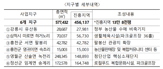 △강릉 유산동 농산물비축기지 △삼척 미로면 웰라이프 생활체육시설 △홍천 서면 팔봉산관광지 확장 △홍천 영귀미면 농촌생활환경정비 △영월 산솔면 첨단핵심소재단지 △정선 임계면 로컬푸드 복합문화시설 등이다. 이번에 지정된 6개 촉진지구는 전체 면적 58㏊ 중 약 79%가 농업진흥지역(절대농지)으로 강원특별법 시행 이전에는 개발이 불가능했다.