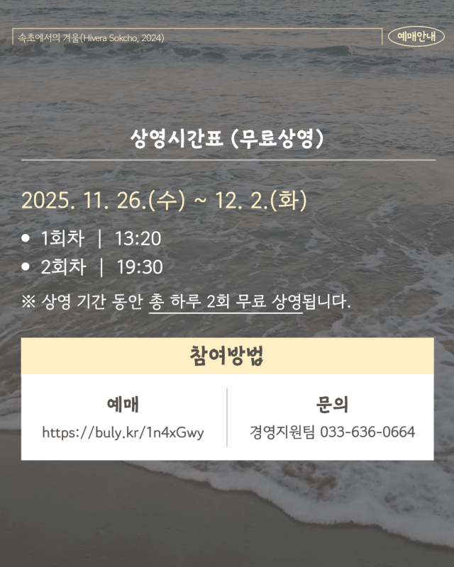 영화 예매는 구글폼(https://buly.kr/1n4xGwy)으로 할 수 있으며, 자세한 문의는 재단 경영지원팀((033)636-0663)으로 하면 된다. 해당 영화는 12세 이상 관람 가능하다.