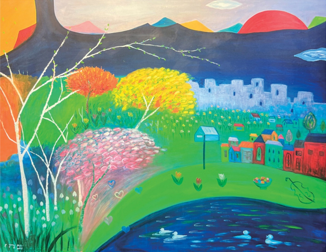전시장에서는 분홍색과 흰색이 어우러진 나무와 수선화, 새싹 돋는 자작나무가 초봄의 설렘을 불러오고 노란 꽃과 붉은 나무가 활짝 피어 생명의 기운을 전한다.성벽과 파스텔 톤 산세는 현실과 이상향의 경계를 넘나드는 듯한 고요한 분위기를 완성한다. 화사한 색감과 따뜻한 시선이 공존하는 작품 세계를 통해 관람객들은 잠시 일상의 근심을 내려놓고 마음을 쉬어가게 하는 휴식의 시간을 느낄 수 있다.
