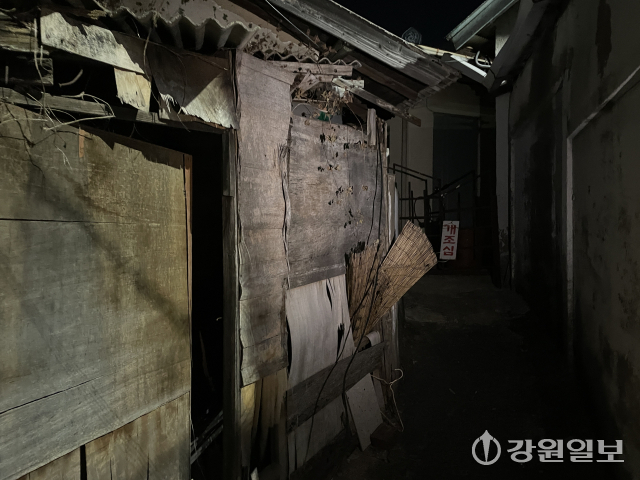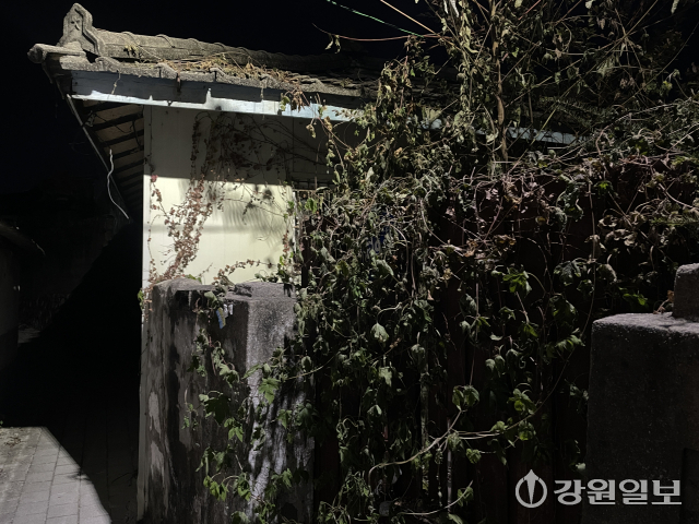 ■빈집, 주민 안전 위협까지=지난 달 21일 밤 춘천교대 부설초교 인근 골목. 끝자락에 자리한 빈집 한 채가 눈에 들어왔다. 돌담은 관리가 끊긴 지 오래된 듯 군데군데 깨져 있었고, 유리창은 금이 가거나 떨어져 나갔다. 대문은 무성하게 자란 덩굴로 뒤덮어 형체를 알아볼 수 없었다. 900여m 떨어진 중부지구대 뒤편에도 빈집 2동이 남아 을씨년스러운 분위기가 감돌았다.