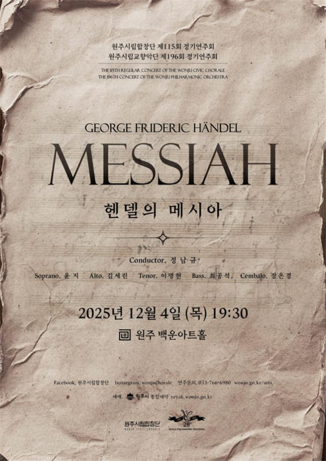 원주 시립합창단과 시립교향악단은 다음달 4일 오후 7시30분 백운아트홀에서 정기연주회 ‘헨델의 메시아’를 한다.
